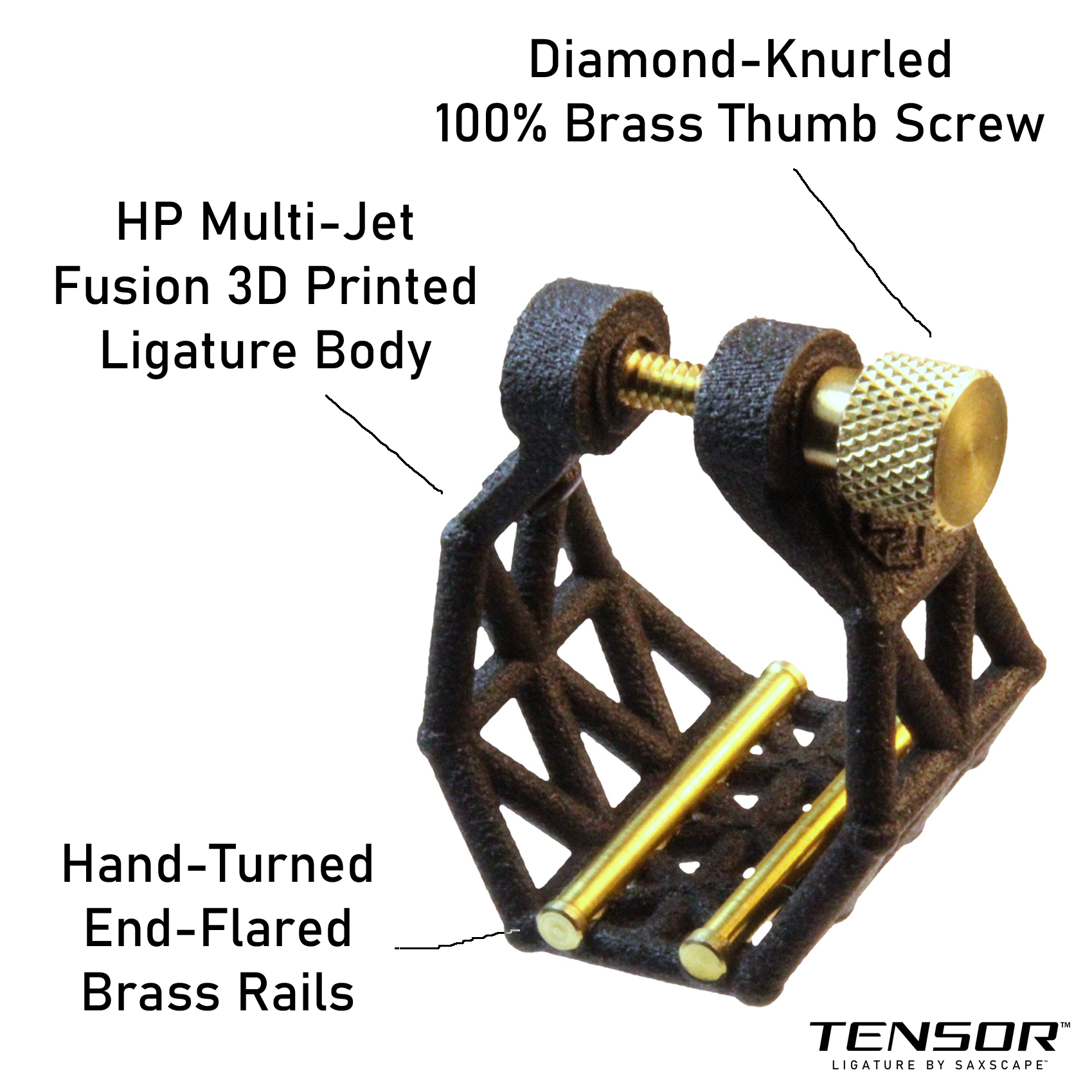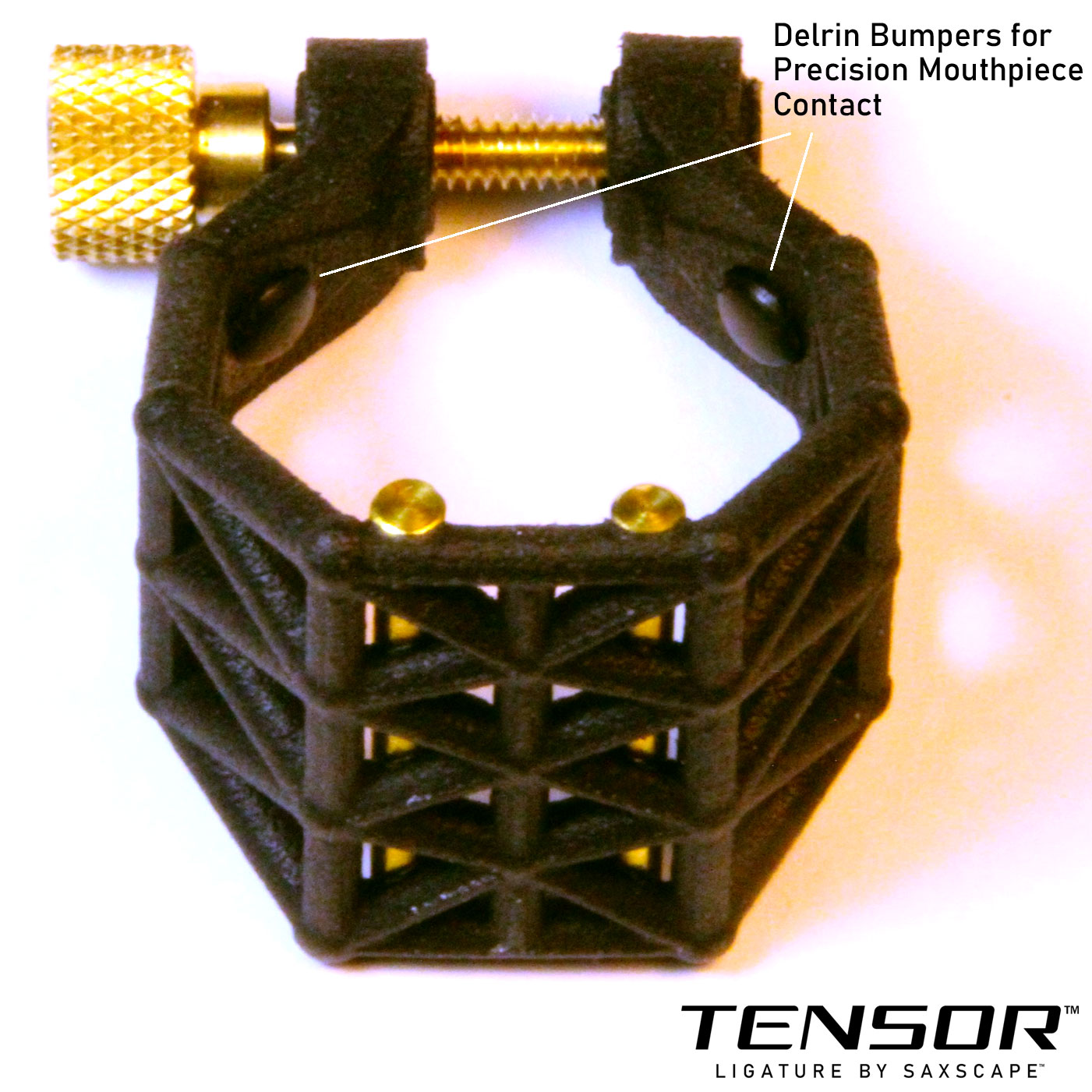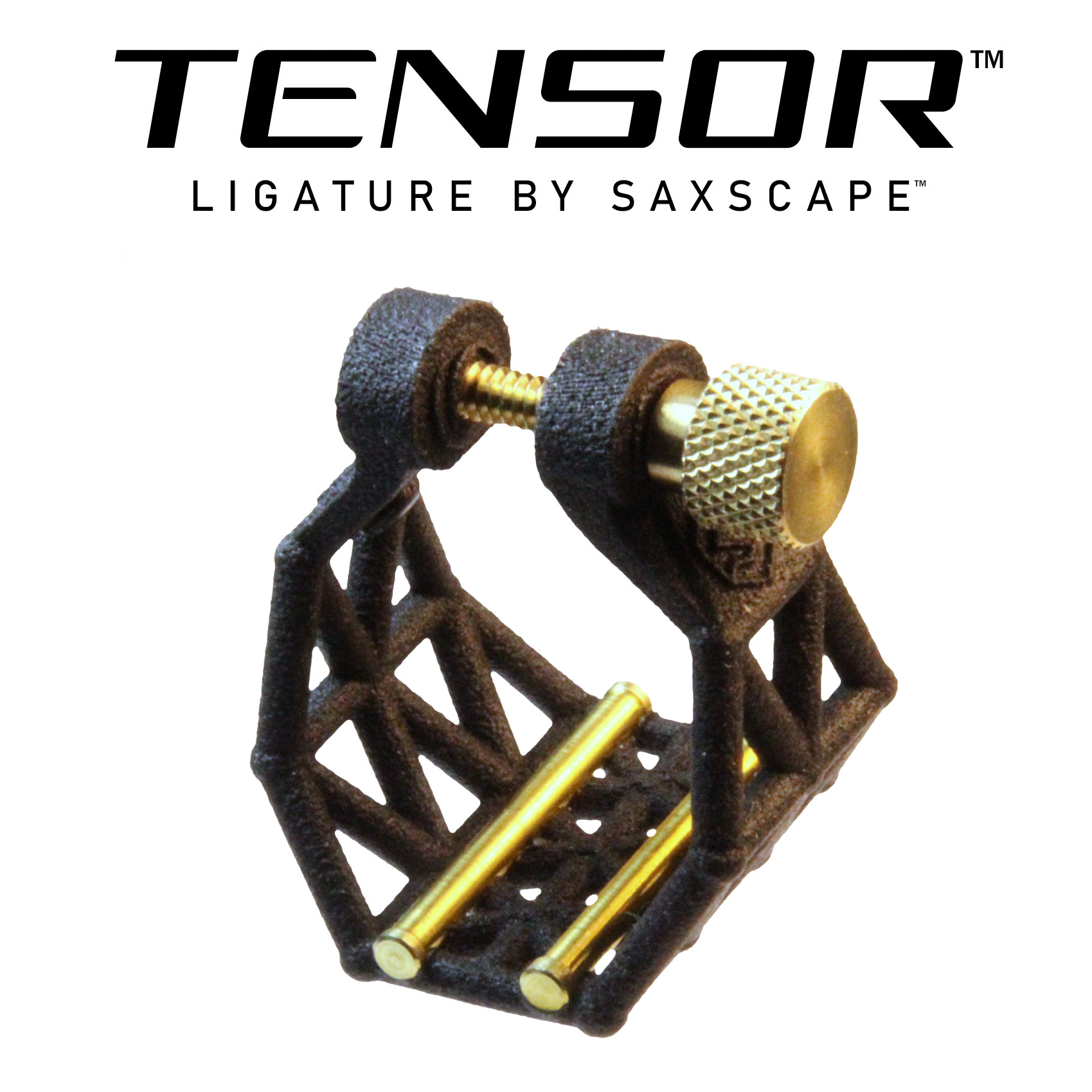 The Tensor Ligature is a new invention that features a highly engineered 3D printed body made from reinforced nylon, designed to provide outward tension to make putting on reeds faster, easier, and more secure. The ligature's truss structure is designed for a balance of strength and flexibility. It also has end-flared brass rails to contact the reed, a diamond-knurled brass thumb screw, and Delrin bumpers which contact the top sides of the mouthpiece. The top part of the ligature is designed to safely clear the famous Otto Link "ridge". The brass rails contact the reed at four points, following a successful tradition from historic ligature designs.