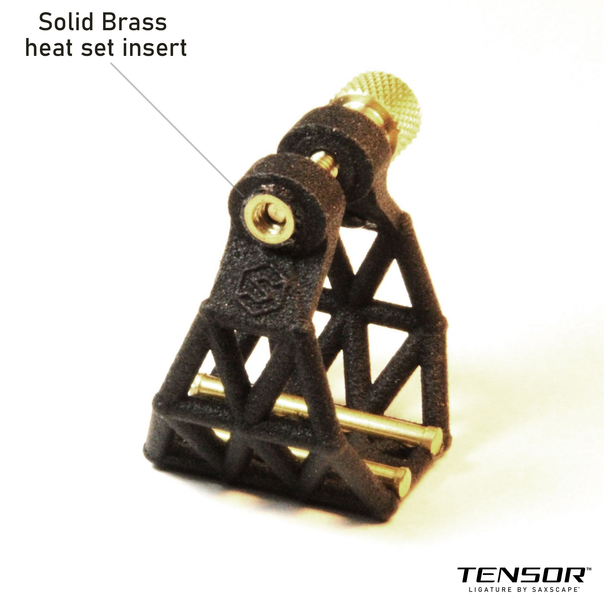 The Tensor Ligature is a new invention that features a highly engineered 3D printed body made from reinforced nylon, designed to provide outward tension to make putting on reeds faster, easier, and more secure. The ligature's truss structure is designed for a balance of strength and flexibility. It also has end-flared brass rails to contact the reed, a diamond-knurled brass thumb screw, and Delrin bumpers which contact the top sides of the mouthpiece. The top part of the ligature is designed to safely clear the famous Otto Link "ridge". The brass rails contact the reed at four points, following a successful tradition from historic ligature designs.