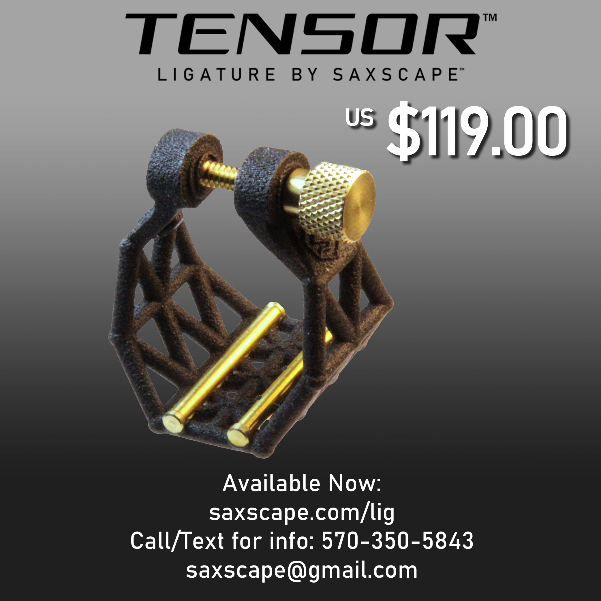 The Tensor ligature retails for US$119.00, and is currently available at the Saxscape Reverb.com Online Store. Designs for other mouthpiece sizes, as well as an all-metal version, are in development.